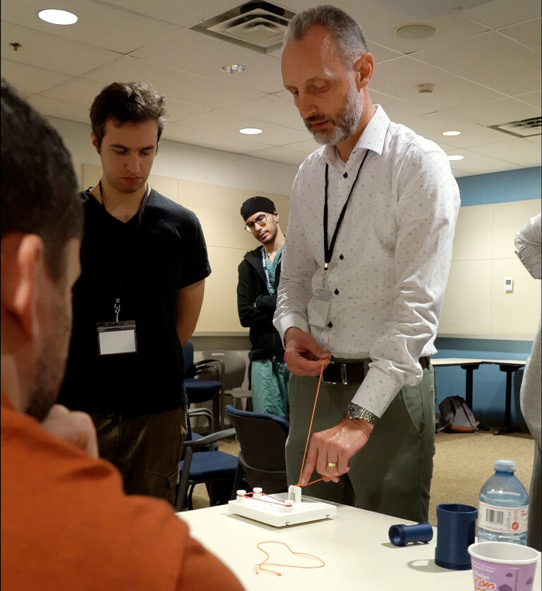 Dr. Mark Wheatcroft, a vascular surgeon at St. Michael’s Hospital, teaches residents using Tiffany Ni and Marco Istasy’s knot-tying board.