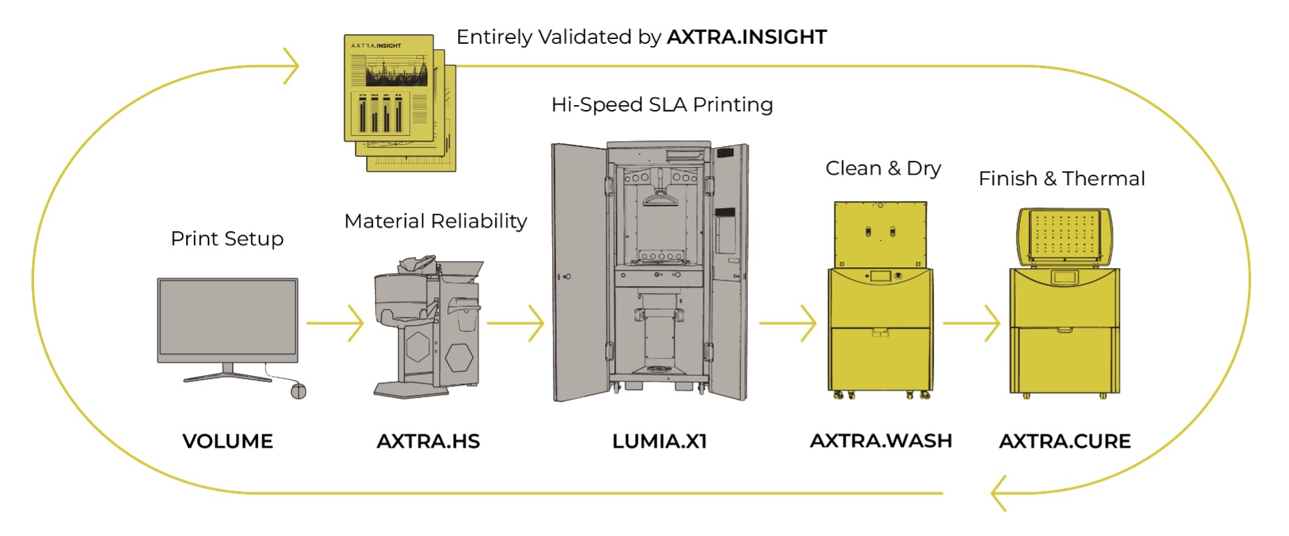 Axtra Workflow is also the first fully connected workflow built specifically around the company’s Hybrid PhotoSynthesis (HPS) technology, connecting printing, washing, curing, and data analytics into a single continuous process.