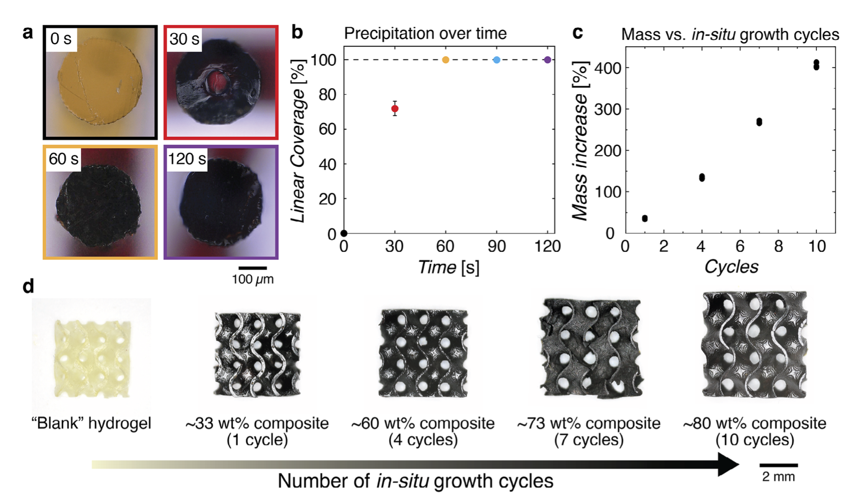Images show iron-infused hydrogels becoming more filled and increasing in mass and size as ammonium hydroxide exposure time and growth cycles increase. Image courtesy of Daryl W. Yee et al., Advanced Materials, 2025. © Wiley.