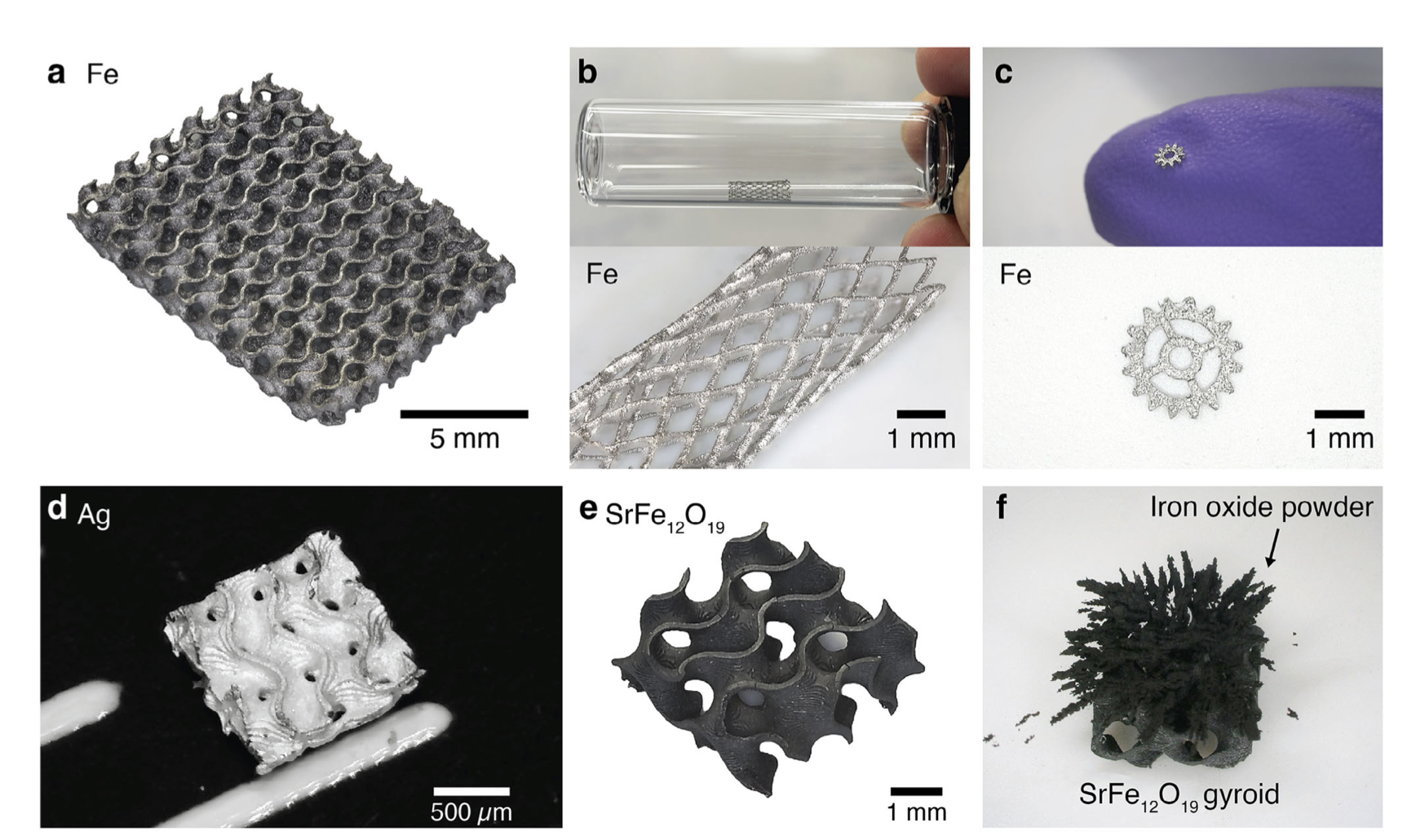 Fe and Ag gyroids and gears made by infusion-precipitation, including a magnetic SrFe12O19 gyroid visualized with iron oxide powder. Image courtesy of Daryl W. Yee et al., Advanced Materials, 2025. © Wiley.