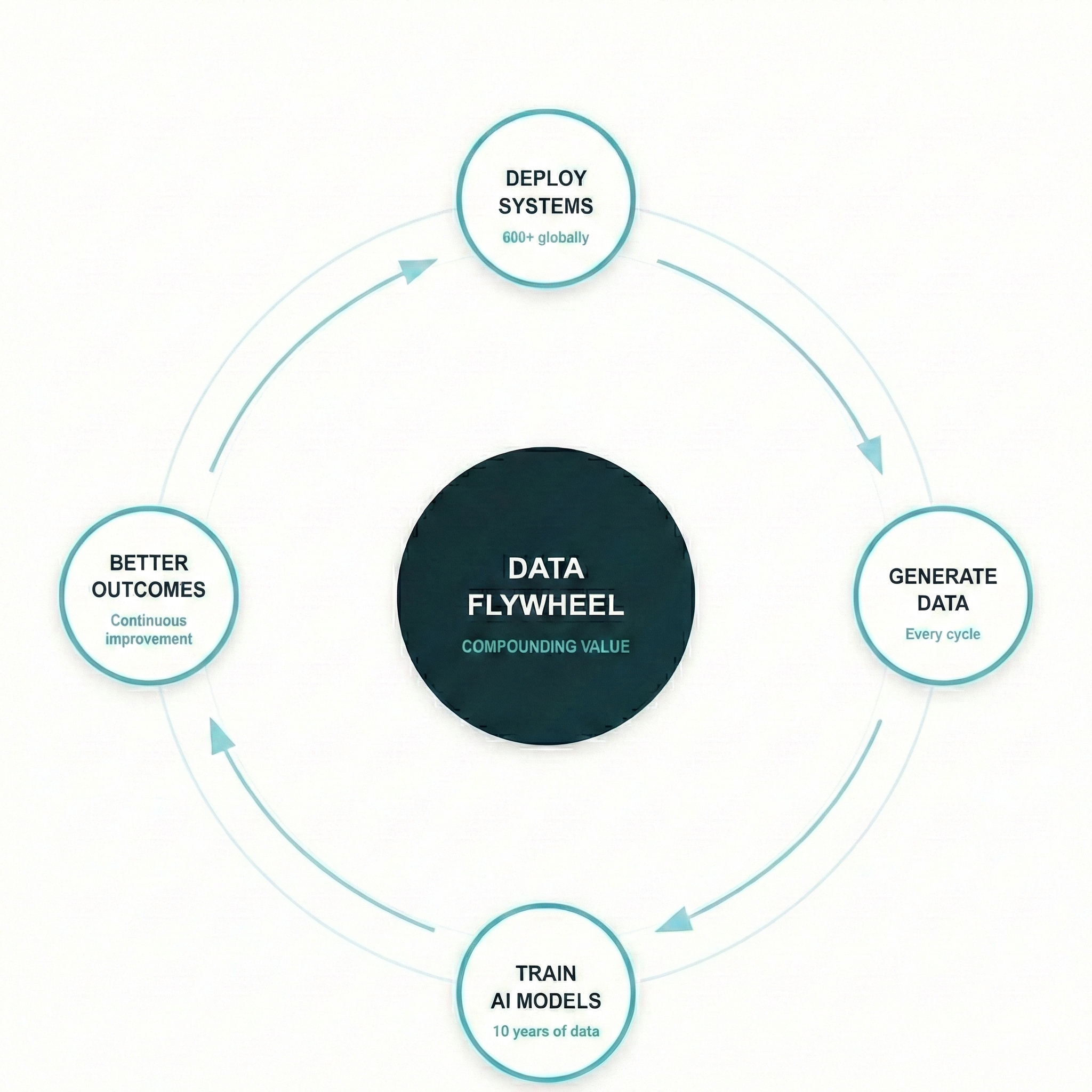 Software operates under fundamentally different economics. Each deployment generates data. The data improves models and processes. Improved performance attracts more customers, which in turn generates more data. The flywheel accelerates.