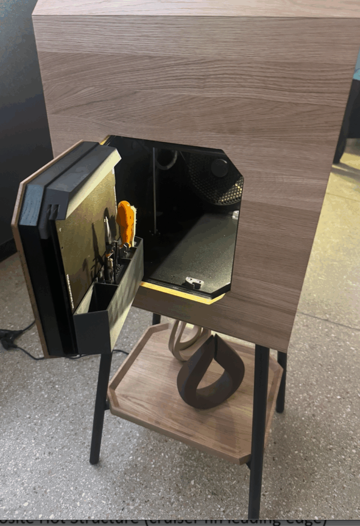 The printer in its heavy oak cabinet is truly beautiful. It takes a desktop material extrusion machine and turns it into an object that lives comfortably in your living room, den, or study. The thing is very heavy and excruciatingly well-made. I’m not sure how many people will want this unit or how much it would go for. But, an accessible wood-paneled printer like this one could really excite many tens of thousands of people, I think.