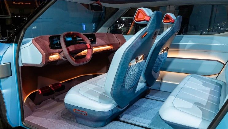 Rear seating of the Kia EV2 concept, showing the 3D knit backrest and modular bench design. Image courtesy of Kia.