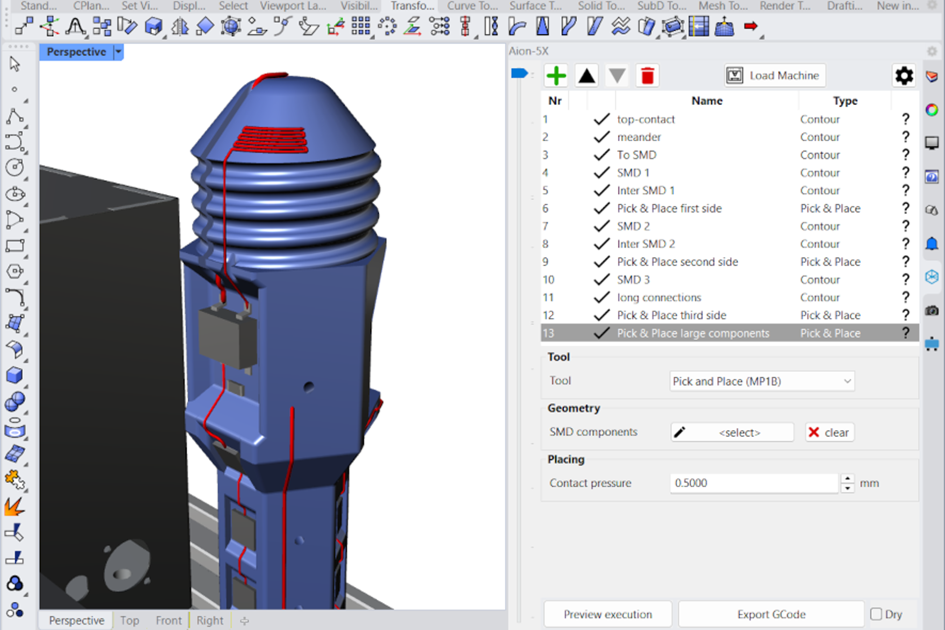 Additional point-dispersion strategies are available for applications such as adhesive dispensing. Camera-based component alignment and fiducial recognition support the precise positioning of prefabricated parts within the printing system. Electronic component management and automated pick&place planning are integrated into the software, enabling the production of fully functional electronic devices within a single machine environment.